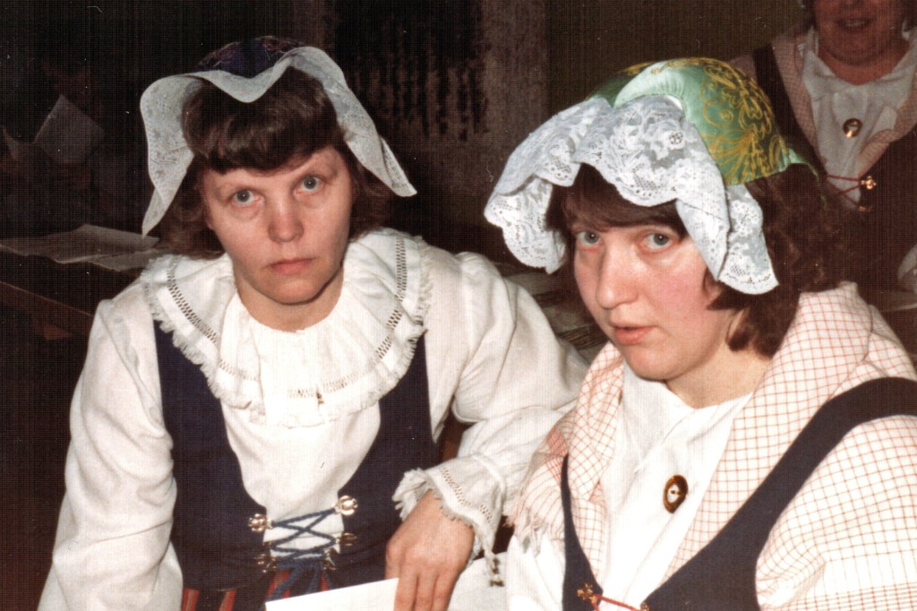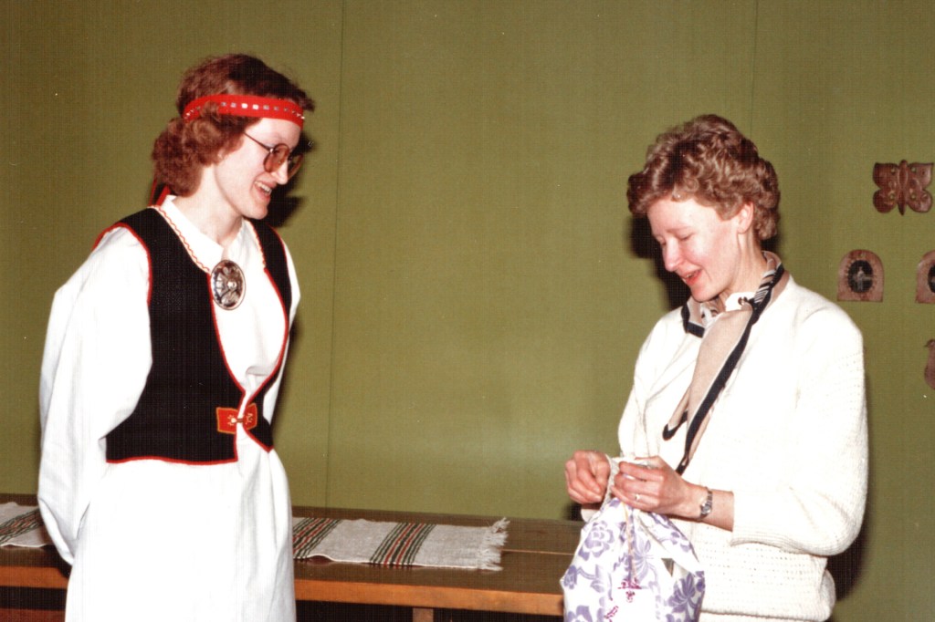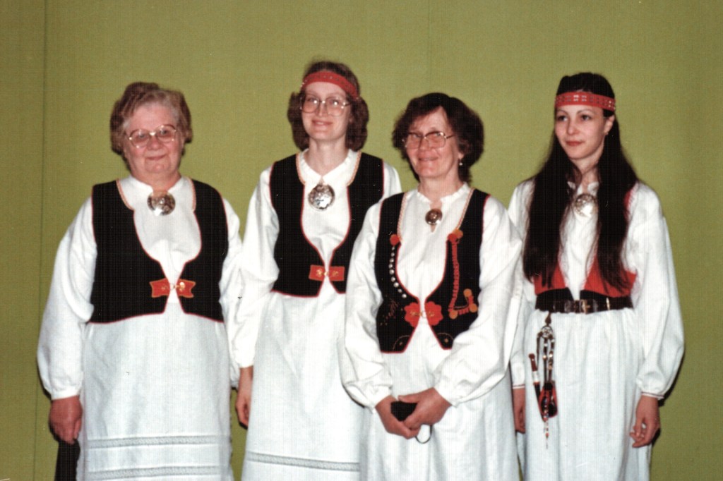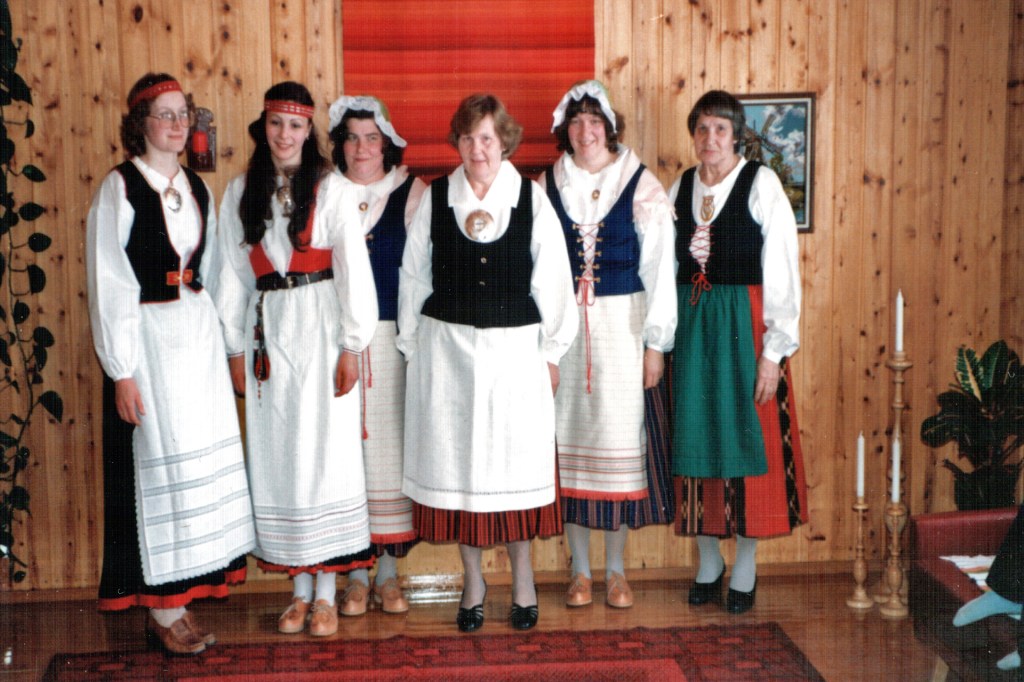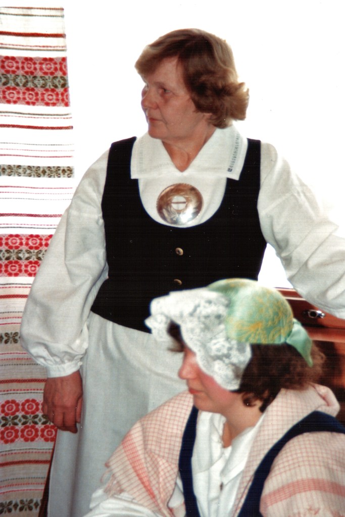 Pieniä vastoinkäymisiäkin koettiin. Eräänä talvi-iltana istuimme Lyylin puolella ompelemassa kansallispukujamme, Lyyli paitaansa minä esiliinan pitsejä kiinnittelin. Sohvapöydälle oli jäänyt Lyylin valmis kauluskappale, jonka reunaa kiersi reikäommel. Nelivuotias Heikki Petteri halusi myös osallistua mummun paidan tekoon ja leikkasi pienillä saksilla koruommelta pitkin yhden sivun, ennen kuin apulaisen touhut huomattiin. Eipä siitä enää kaulusta saanut – uusiksi meni kauluskappale.