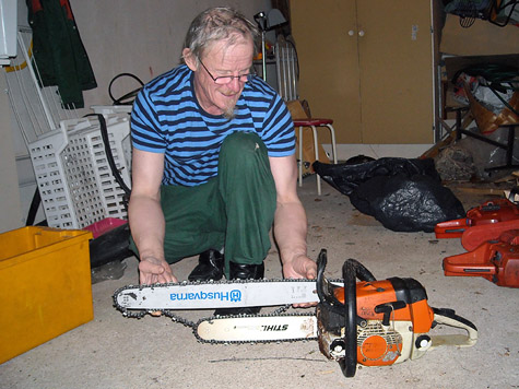 ”Ensimmäine moottorsaha mulla ol Pioneer, 1970-luvun alussa. Se ol jo kevysempi, ku muilla sillon olleet painavat 60-luvun sahat, se paino noin 8,5 kiloa. Se on vieläkin tallessa ja käyntikuntonen. Paras moottorsahamerkki on kyllä Husku, mutta raivaussahana Stiili on parempi”.