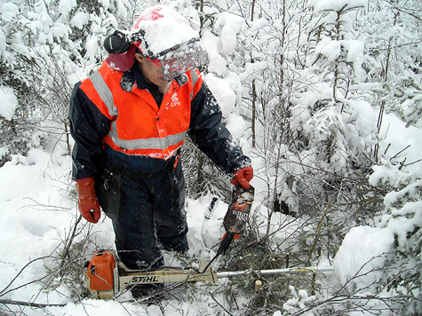 ”Helle, mäkäräiset ja hirvikärpäset on loppuin lopuks hankalimmat olosuhteet. Viileämmällä kelillä on mukavampi tehä, jaksaa paremmin, ves- ja lumsaekkaan ei haettoa nykyvään, ku on kunnon varusteet. Iliman kunnon varusteita tästä hommasta ei tulis mittään. Varusteet on työnantajan puolesta eikä niitä enneä nykyvään tarvihe metsurin ite maksoa. Saha on tietenki oma ja sen kulut ja huollot kuuluu itelle”.