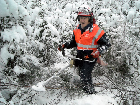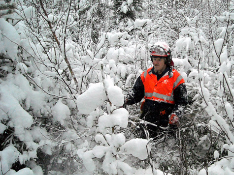 Taimikonhoitotyömaana on tällä erää n.3 metrinen istutettu kuusentaimikko. Puissa on edellisenä päivänä ja yönä satanutta räntälunta reippaasti ja lisää tulee koko ajan.