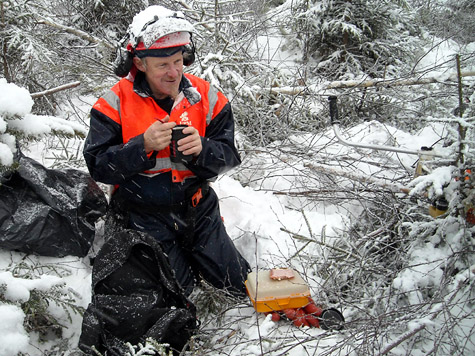 ”Päevän aekana enerkiata kulluu niin sahassa ku miehessäki. 5-6 tankkausta joka päevä. Samalla ku tankkoa sahhoa, kannattaa pikkuse ottoa välpalloa ja pitteä taukoa niin jaksaa paremmi – päevästä toeseen. Nykyvään on hyvät termospullot ja eväsastiat, keitto ja kahvi on lämmintä vielä iltapäevälläki”.