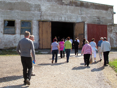 Pääsimme katsomaan uutta navettaa sisältäpäin smurffi-jalkineiden kera, osa olisi mielellään laittanut siniset muovit kenkien suojaksi jo aiemminkin, maa oli hyvin vettynyt ja liejuinen. Vettä oli satanut viimepäivinä kuulemma runsaasti, viljan puinti oli tästä syystä myöhässä. Moni kolkkulainen olisi varmasti mielellään ottanut osan vesisateen maillensa, ei pelkästään siksi että tanssikengät olisi paremmin pysynyt puhtaina, vaan koska kaivot alkoivat olla hyvin kuivia Kolkun tiloilla ja taloilla. Lopuksi ajoimme vielä bussilla kiertoajelun tilan maita, lähinnä peltoja katsellen itse isännän opastuksella.