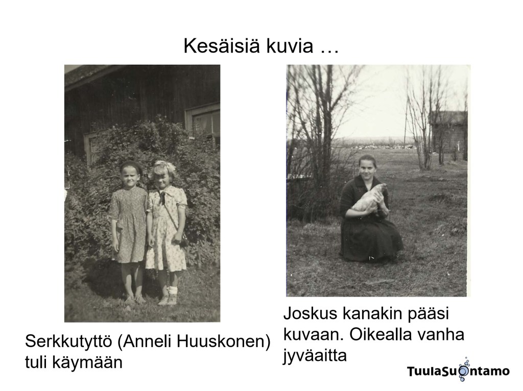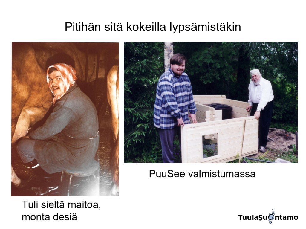 Olit kaupunkilaispoika, mutta et vierastanut maalaiselämää. Päinvastoin. Halusit oppia, tai ainakin kokeilla, tyypillisiä maalaistalon töitä. Ensim-mäinen kiinnostuksen kohteesi oli lypsäminen. Navettatakki päälle, ämpäri käteen, jakkara lehmän viereen ja ei muuta kuin yrittämään. Ja ihmeellistä kyllä, maitoa tirisi ämpärin pohjaan aika topakasti. Eikä lehmä edes potkaissut ämpäriä nurin. Et sinä lypsäjäksi kuitenkaan ruvennut, kuhan kokeilit.