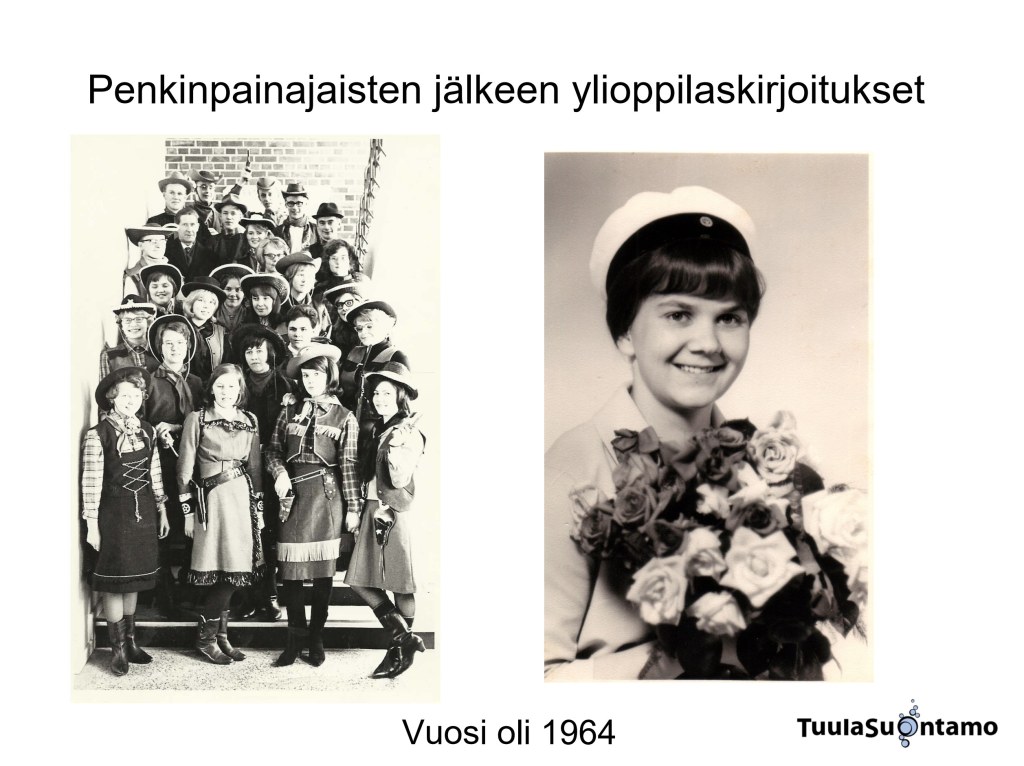 Tiemme kohtasivat opiskelun merkeissä vuonna -65. Tupsahdit viereeni matematiikan luennolla ja koetit päästä jutun alkuun. Olin arka maalaistyttö, juttu ei oikein luistanut. Ei rakkaus tässä vielä roihahtanut, mutta jotain siinä kuitenkin tapahtui. Liikuimme eri opiskelijaporukoissa, mutta sivusilmällä seurailimme toisiamme. Kumpikin.