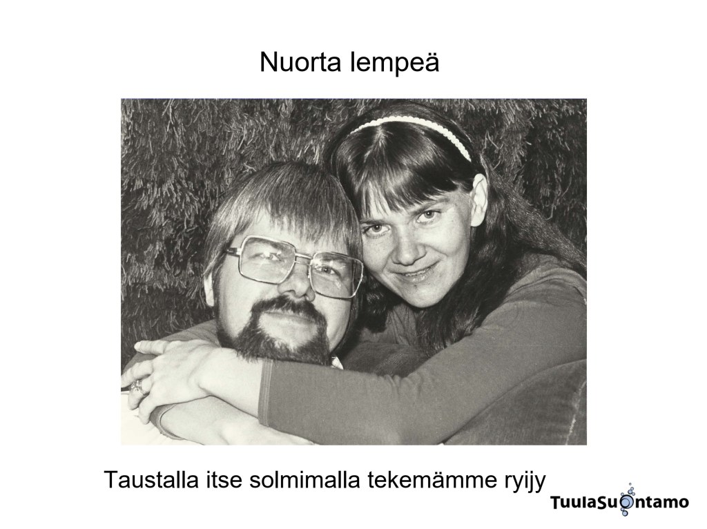 Huumori ja toisen ihmisen kunnioittaminen, siinä liima pitkään avioliit-toomme. Sinulla oli myös ilmiömäinen kyky säilyttää perhesopu. Tässä yksi esimerkki. Olin joskus avioliittomme alkuaikoina kurkkuani myöten täynnä sinun tietokoneharrastustasi. Rakensit tietokoneen, jota näpelöit kaiket illat ja vähän öitäkin. Sain puhua selkäsi kanssa. Tulit yöllä kylmine varpainesi saman peiton alle, huomasit minun heränneen ja kerroit intoa puhkuen ohjelmointisi toimivan. Niin kuin se olisi muka minua kiinnostanut. Pimahdin. Panin sinut valitsemaan: joko tietokone tai vaimo. Tuumasit, että eihän tästä nyt noin isoa meteliä kannata nostaa. Pakkasit tietokoneen laatikkoon ja nostit vaatehuoneen hyllylle. Syksyn tullen tietokone kuitenkin nostettiin taas pöydälle. Sait innostuksesi tarttumaan minuunkin ja muutama vuosi myöhemmin opetin tieto-tekniikkaa Keski-Suomen kotitalousopettajaopistossa. Sanotaan, että älykäs mies pärjää konstikkaankin naisen kanssa. Se taitaa pitää paikkansa.