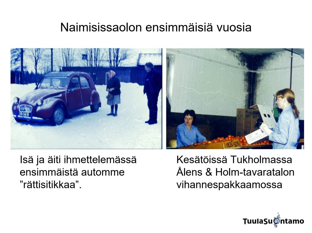 Meidät vihittiin jo samana syksynä lokakuussa -69. Emme järjestäneet isoja kirkkohäitä. Pyysimme opiskelijapastorin, Martti Miettusen, vihkimään meidät ensimmäisessä yhteisessä asunnossamme, pikku yksiössä. Se saatiin tapetoitua ja maalattua juuri ennen h-hetkeämme. Todistajiksi kutsuimme vanhempiemme lisäksi vain molempien sisarukset perheineen.