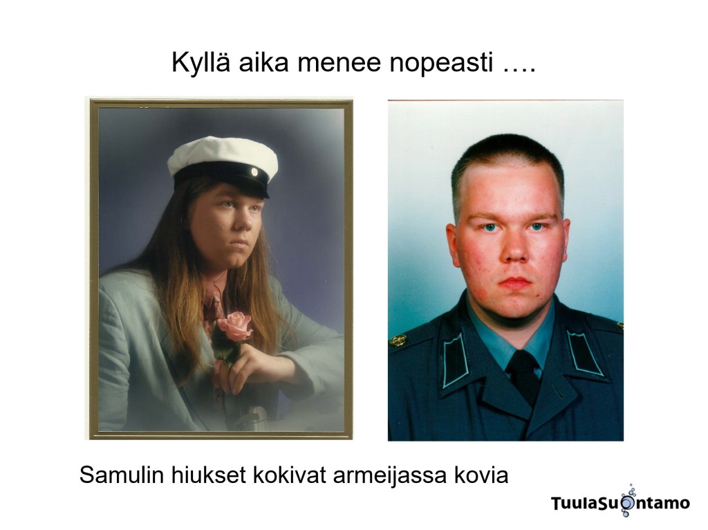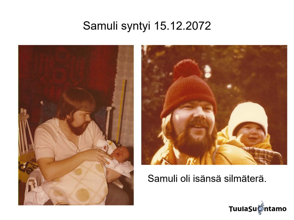 Eipä pastorimme tuolloin tiennyt, että hän vihkaisemisellaan rikkoi silloista lakia. Hän nimittäin vihki, henkikirjoituslomakkeen merkintöjen mukaan, kaksi miestä aviopuolisoiksi. Sosiaaliturvatunnus oli juuri otettu käyttöön ja olin saanut siihen miehen tunnuksen. Korjauksistani huolimatta sitä ei heti muutettu ja niinpä seuraavan henkikirjoitus-lomakkeen mukaan kaksi miestä oli avioitunut. Virhemerkintä pysyi vielä vuoteen -72 eli Samulin syntymään saakka. Niinpä keskenään avioituneet miehet olivat saaneet lapsenkin, papereiden mukaan. Onnekseni sinä ja pastori luotitte enemmän silmiinne kuin henkikirjoituslomakkeeseen.