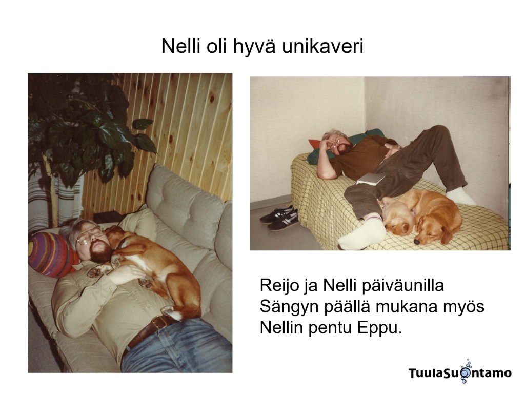 Yhteiseen elämäämme liittyy myös koira, monirotuinen Nelli. Se piti huolta kunnostasi, vaati pitkiä kävelylenkkejä, kesät talvet. Toisaalta Nelli oli aina valmis tulemaan kaveriksi päiväunille. Kaksi tuhisijaa kylki kyljessä oli hellyttävä näky.