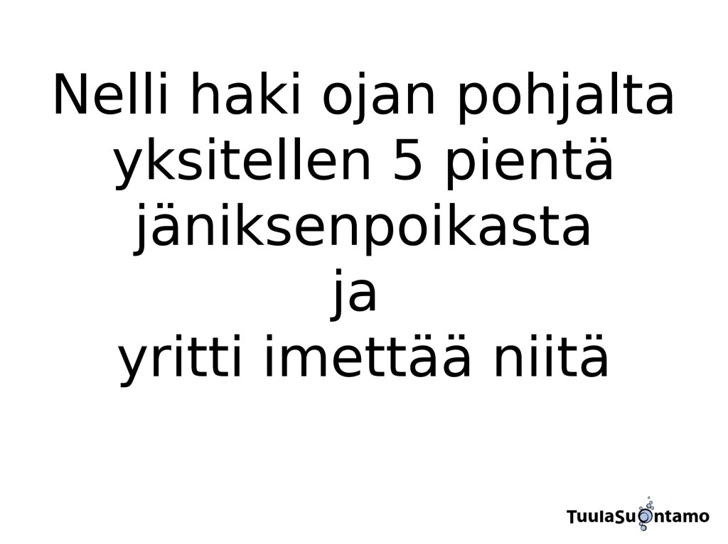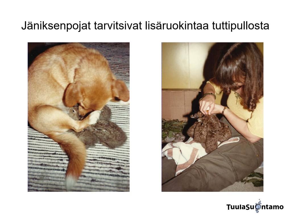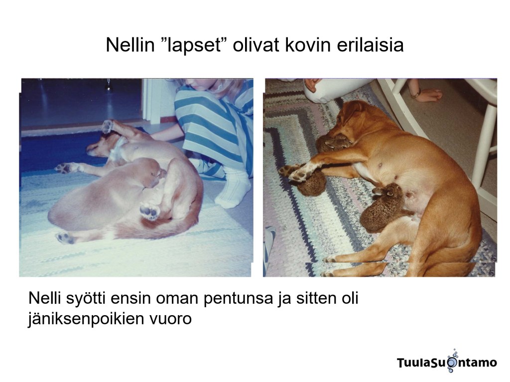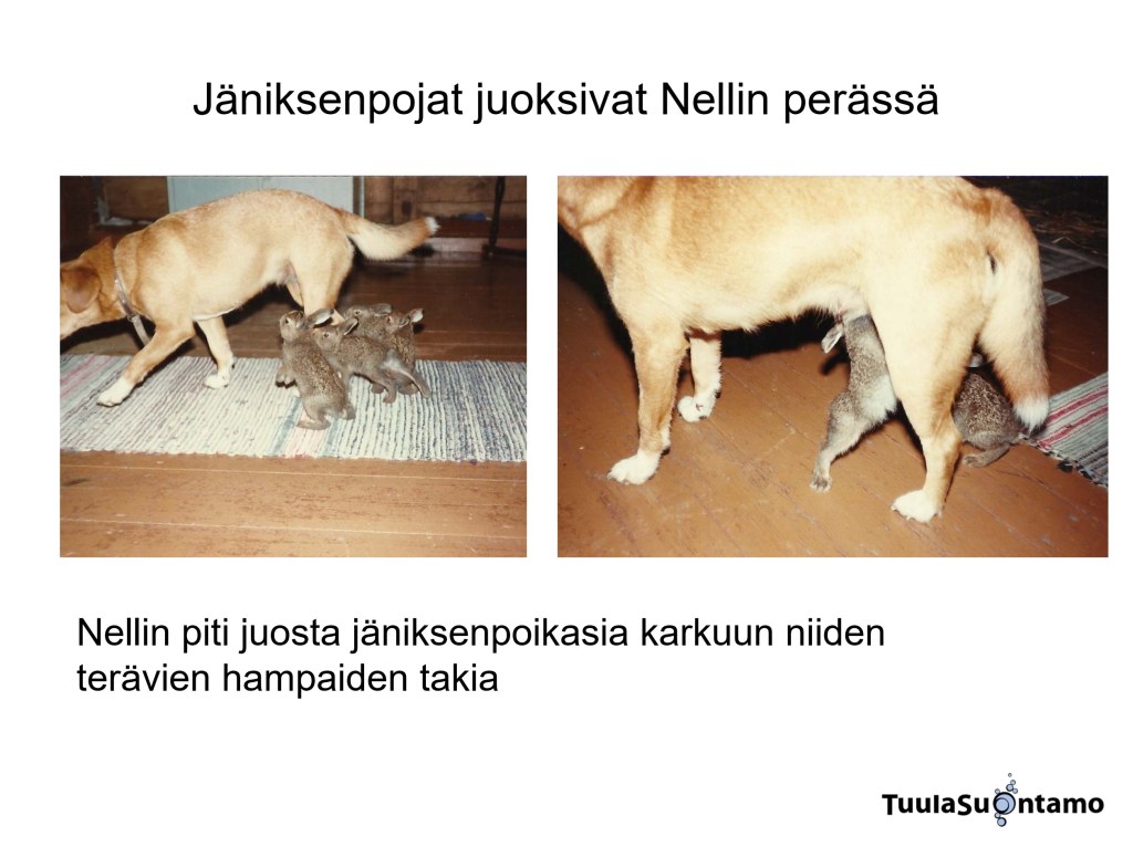 Nelli järjesti meille Kolkulla ollessamme aika erikoisen yllätyksen ja paljon muisteltavaa. Yhtenä päivänä Nelli haki pellon ojasta yksitellen viisi pienen pientä jäniksenpoikasta ja rupesi hoitamaan niitä. Äidin-vaisto oli pinnassa, olihan Nellillä tuolloin yksi omakin pentu. Pikku jänisten suut olivat tosin niin pieniä, etteivät ne pystyneet imemään maitoa Nellin nisästä. Emonmaidonvastiketta oli mukana, mutta koiranpentua varten ostettu tutti oli liian iso pikkujäniksille. Ne pystyivät kuitenkin pienellä kielellään nuolaisemaan tutista puristamani maitopisaran. Viiden nälkäisen poikasen syöttäminen maitopisara kerrallaan oli hidasta ja vaati kärsivällisyyttä. Mutta se kannatti. Jäniksenpojat varttuivat emonmaidonvastikkeesta ja Nellin muusta hoivailusta nauttien. Koira hoivaamassa jäniksenpoikasta, aika erikoinen perheidylli. Kun jänikset kasvoivat, Nelli ei enää halunnutkaan imettää poikasia, vaikka nyt imeminen olisi muuten onnistunut. Innokkaat imijät tuntuivat Nellistä epämukavilta, purijoilta, syystä että jäniksen hammasrakenne on kovin erilainen kuin koiran. Nauroimme monet makeat naurut, kun koiramme, beaglen ja pystykorvan sekoitus, juoksi karkuun ja viisi pientä jänistä ajoi sitä takaa ympäri Suurensuonmäen suuren tuvan lattiaa. Loman loputtua tulimme koko konkkaronkka kaupunkiin. Ennen kuin veimme jänikset Ähtärin eläinpuistoon, kutsuin MTV3:n tekemään tästä erikoisuudesta kevennyksen kymppiuutisten loppuun. Se tehtiin ja tulikin ulos heti samana iltana, ja monta kertaa uusintanakin.