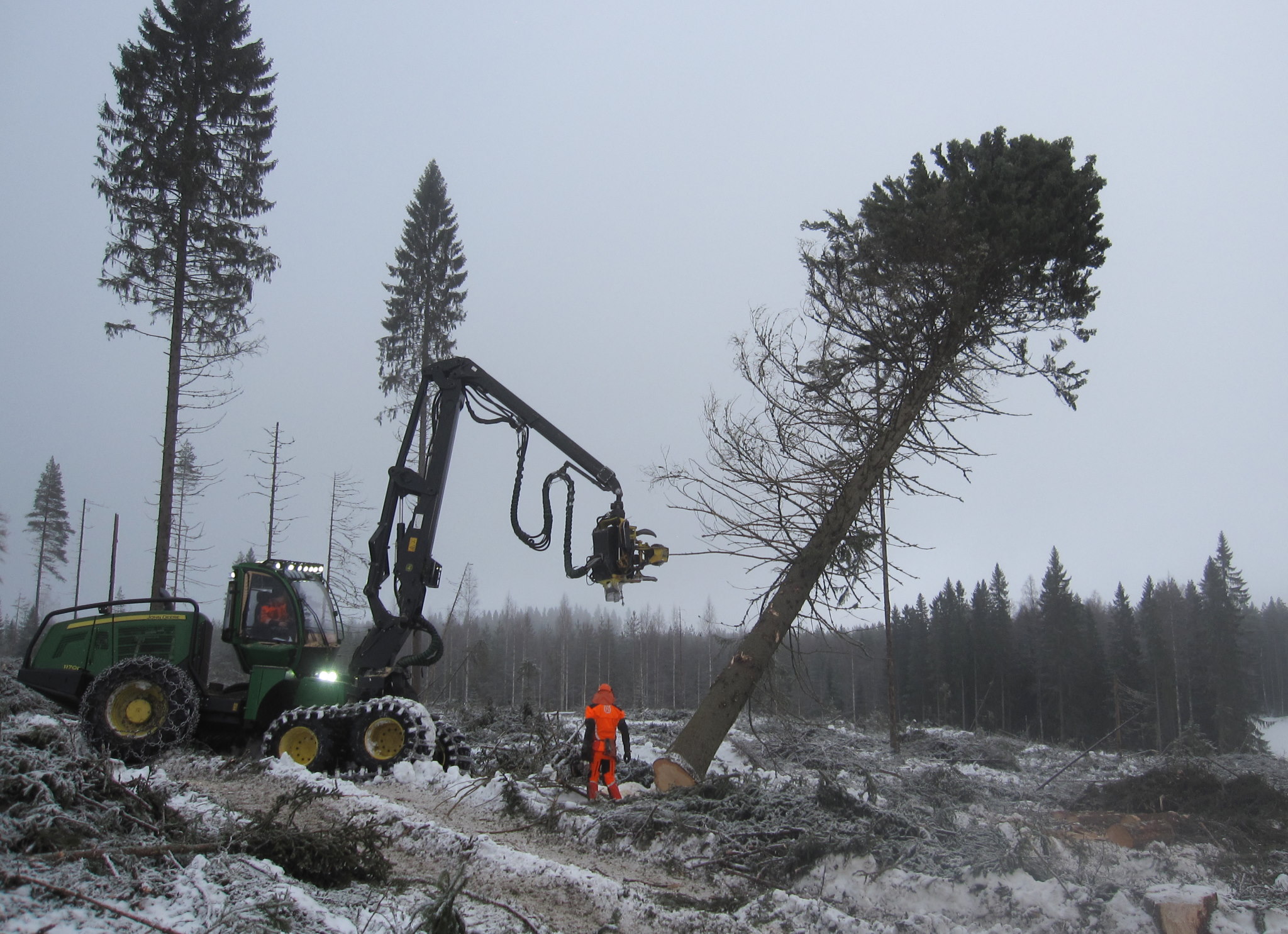 ”Näin järeä, oksainen kuusikko on tämmöiselle isollekin motolle haastava. 30 metrisestä puusta lähtee 4-5 tukkia ja hankeen kaatuneen painavan rungon vetäminen ei tahdo onnistua – aluksi kouraa on juoksutettava tyvestä maassa olevaa runkoa pitkin ja katkottava sitä paikallaan. Varsinkin tämän koneen jo 10-vuotias hakkuupää on koko ajan äärirajoilla. Hakkuupäällä ei enää tyvestä yli 70-senttistä ja 30-metristä runkoa ole turvallista muutenkaan kaataa. Osa tämän leimikon puista jää metsurin kaadettavaksi”, toteaa Metsäkoneurakointi Moision metsäkoneen kuljettaja aloitellessaan hakkuuta.