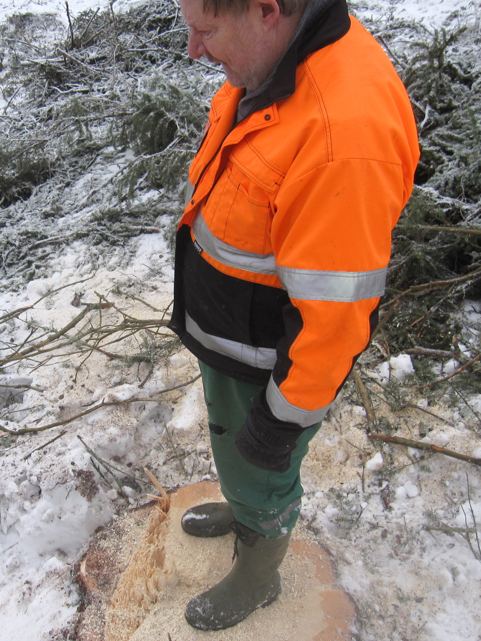 Tässä kaatuu 120-vuotias, yli 30 metriä pitkä kuusi, jonka tyvi oli yli 85-senttinen. Puuta kuusessa oli reippaasti yli 4 kiintoa. ” Alkaa olla rajoilla, kelpaako tämä enää sorvitukiksikaan vaneritehtaalle. Tyvi saisi olla enintään 75 senttinen, jotta se sopisi sorviin. Sahalle näitä isoja tukkeja ei ole enää kelpuutettu pitkään aikaan”, toteaa metsuriyrittäjä Saastamoinen.